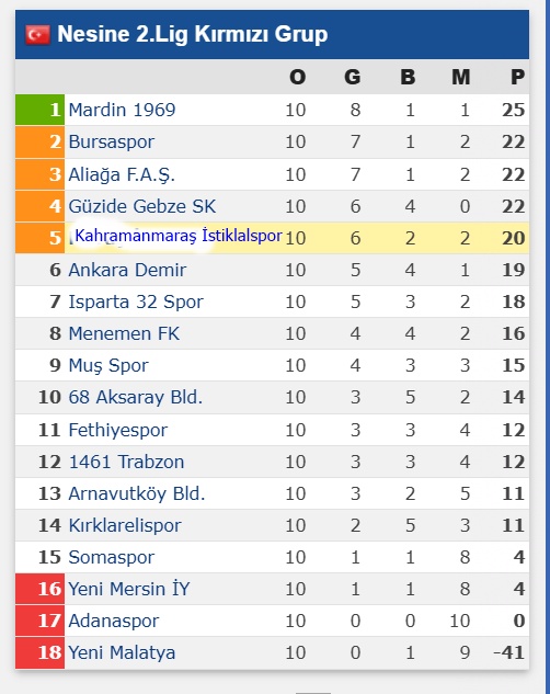 2. Lig Kırmızı Grup’ta 10. Hafta Puan Durumu, Haftanın Sonuçları ve 11. Hafta Maç Programı