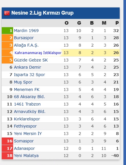 TFF 2. Lig Kırmızı Grup’ta 2025-2026 sezonunun 13. hafta heyecanı, 29-30 Kasım 2025 tarihlerinde oynanan maçlarla tamamlandı. Kahramanmaraş temsilcisi Akedaş Kahramanmaraş İstiklalspor, 14. haftada sahasında Gebzespor ile karşı karşıya gelecek.