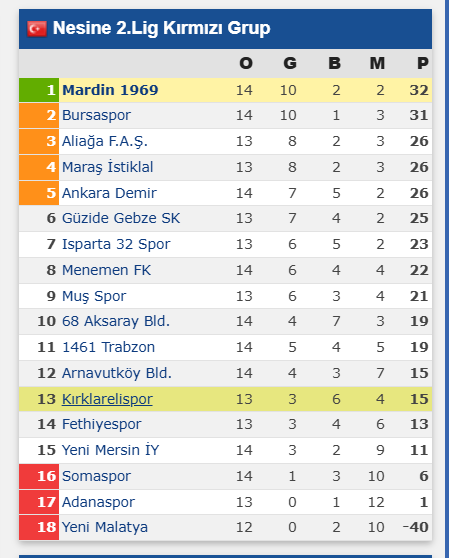 TFF 2. Lig Kırmızı Grup’ta 2025-2026 sezonunun 14. hafta heyecanı, 6-7 Aralık 2025 tarihlerinde oynanan karşılaşmalarla tamamlandı. Cumartesi Sonuçları (14. Hafta) Mardin 1969 Spor 1-2 Bursaspor KCT 1461...
