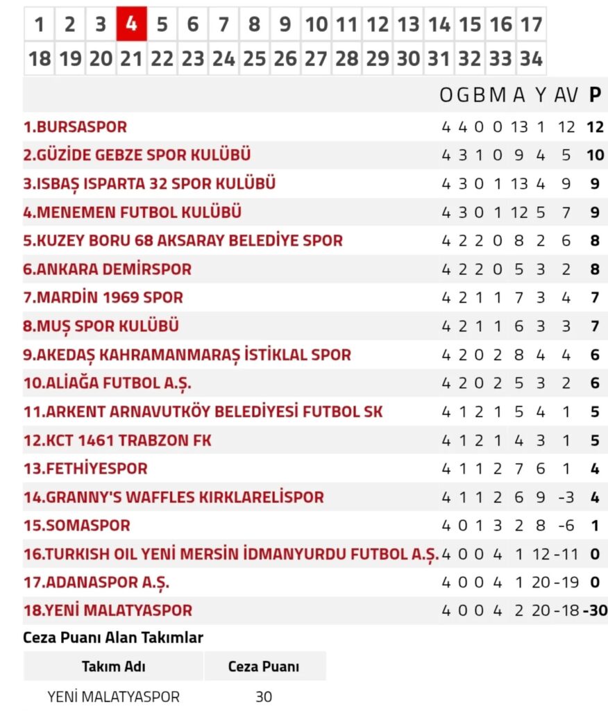 (4. hafta oynanan maçların ardından güncel puan durumu