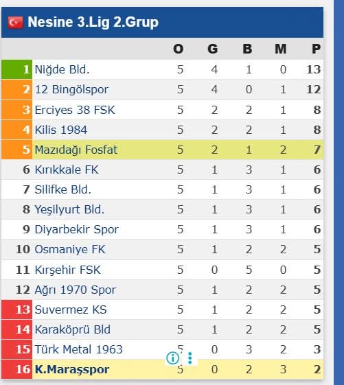 TFF 3. Lig 2. Grup’ta yer alan Kahramanmaraşspor, 2025-2026 sezonunun 5. hafta karşılaşmasında Silifke Belediyespor ile sahasında 2-2 berabere kaldı. Geride kalan haftada grupta çekişmeli mücadeleler yaşanırken, birçok karşılaşma bol gollü geçti.