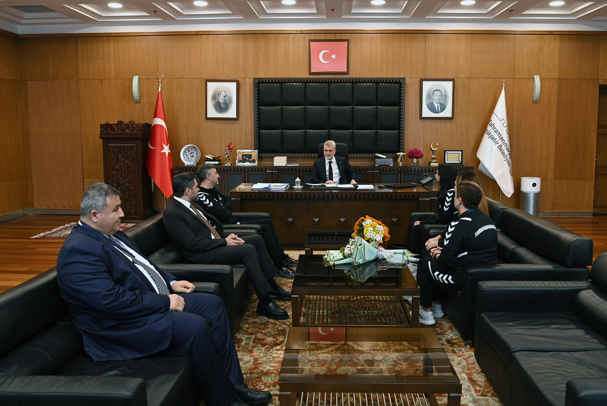 Kahramanmaraş Büyükşehir Belediye Başkanı Fırat Görgel’in önemli desteği ile kurulan ve kısa süre içerisinde gösterdikleri performansla kulüp düzeyinde ilk kez Türk takımın katıldığı 2025 Goalball Şampiyonlar Ligi’nde ikinci olarak tarihi bir başarıya imza atan Büyükşehir Belediyesi Kadın Goalball Takımı, Başkan Fırat Görgel’i makamında ziyaret etti. Teknik direktör Gültekin Karasu, teknik ekip ve sporcuları tek tek tebrik ederek başarılarının devamını dileyen Başkan Fırat Görgel, takımla gurur duyduklarını belirtti. Teknik ekip ve sporcular ise Başkan Fırat Görgel’e takıma verdiği desteklerden dolayı teşekkür etti.