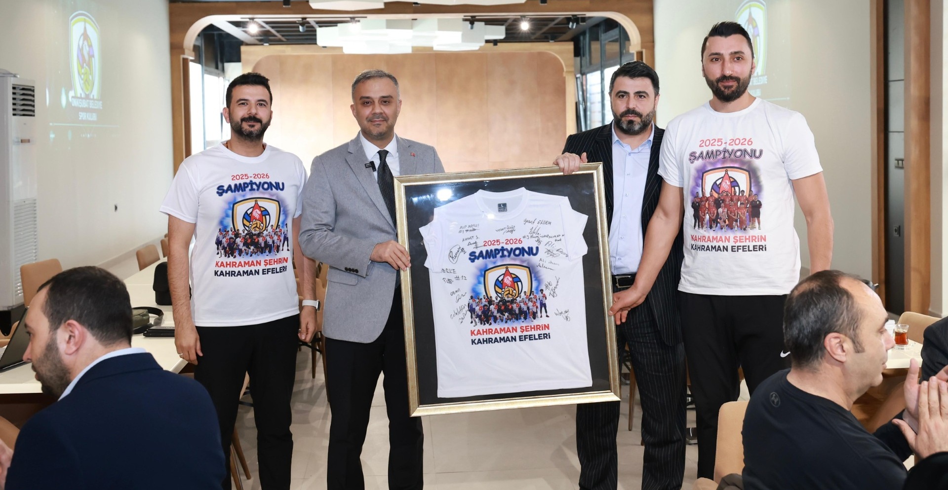 Şampiyonluk yemeğine Kulüp Başkanı Ökkeş Alper Erşahan ile Takım Antrenörü Mehmet Aydın’ın yanı sıra Onikişubat Belediye Spor Kulübü Yönetim Kurulu üyeleri Cemil Toktay, Ümit Barış Bayhan, Mesut Can, Suat Paksoy, Takım Kaptanı Yusuf Erdem, antrönerler ve oyuncular katıldı.
