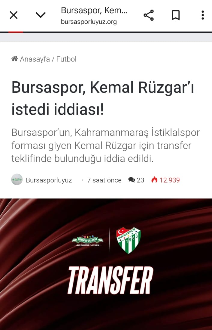 Bursaspor’a yakın haber sitelerinde yer alan bilgilere göre, yeşil-beyazlı kulübün Kahramanmaraş İstiklalspor forması giyen Kemal Rüzgar için transfer teklifinde bulunduğu öne sürüldü. “Bursaspor, Kemal Rüzgar’ı istedi iddiası!” başlığıyla servis edilen haberler, kısa sürede büyük ilgi gördü.
