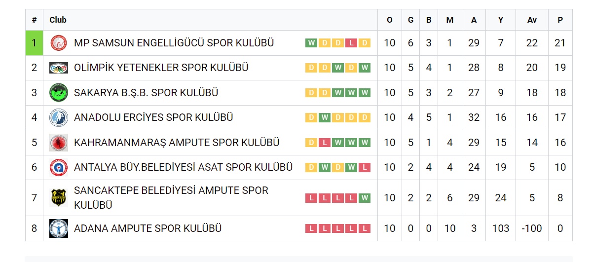 Bu sonuçla puanını 16’ya çıkaran Kahramanmaraş Ampute Spor Kulübü, haftayı 5. sırada tamamladı. Zirve yarışında darbe alan Sakarya B.Ş.B. Spor Kulübü ise 18 puanda ve 3. sırada kaldı.
