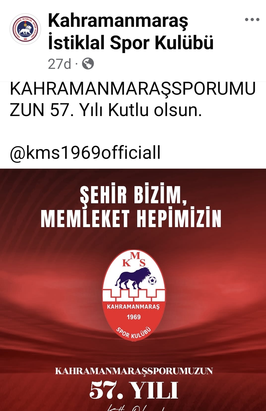 “Kahramanmaraşsporumuzun 57. Yılı kutlu olsun” ifadelerinin yer aldığı paylaşımda, “Şehir bizim, memleket hepimizin” mesajı da dikkat çekti. Yapılan kutlamada özel olarak hazırlanan görsele de yer verildi
