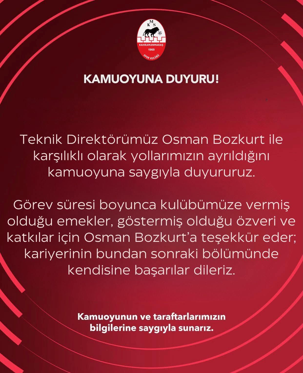 > “Teknik Direktörümüz Osman Bozkurt ile karşılıklı olarak yollarımızın ayrıldığını kamuoyuna saygıyla duyururuz.