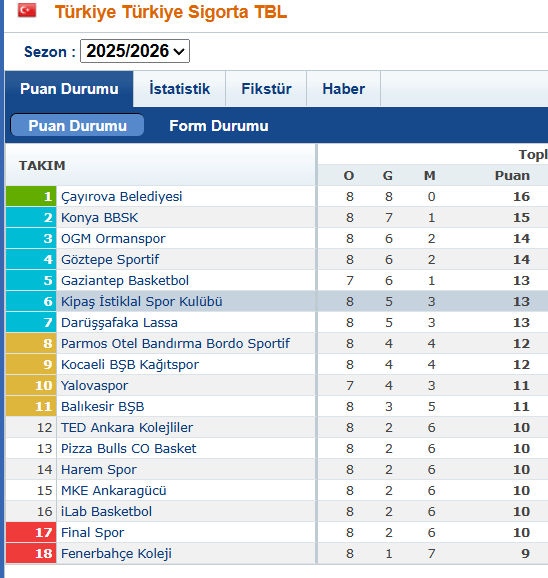 Türkiye Basketbol Ligi’nde 8. hafta maçları sonunda oluşan puan durumu.