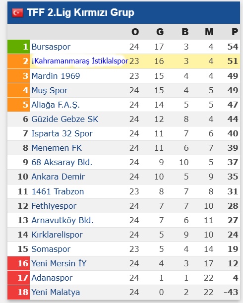 Kahramanmaraş’ı grupta temsil eden Akedaş Kahramanmaraş İstiklalspor, sahasında Isparta 32 Spor’u 2-1 mağlup ederek önemli bir galibiyete imza attı. Temsilcimiz, 25. haftada deplasmanda Kırklarelispor ile karşı karşıya gelecek.