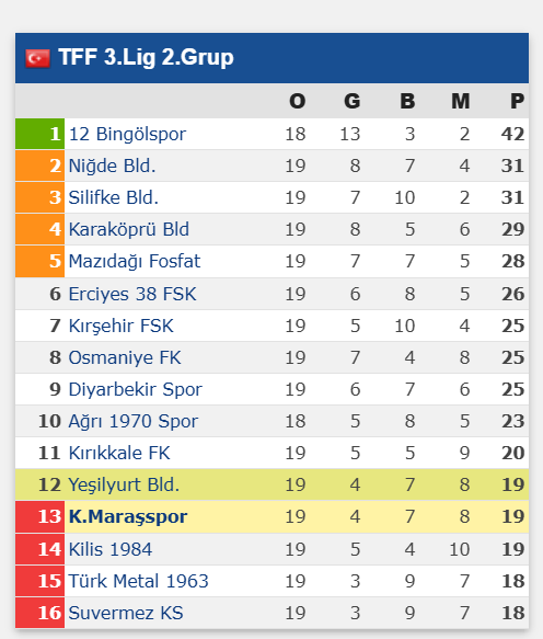 Kahramanmaraşspor’un Yer Aldığı TFF 3. Lig 2. Grup’ta 19. Hafta Tamamlandı